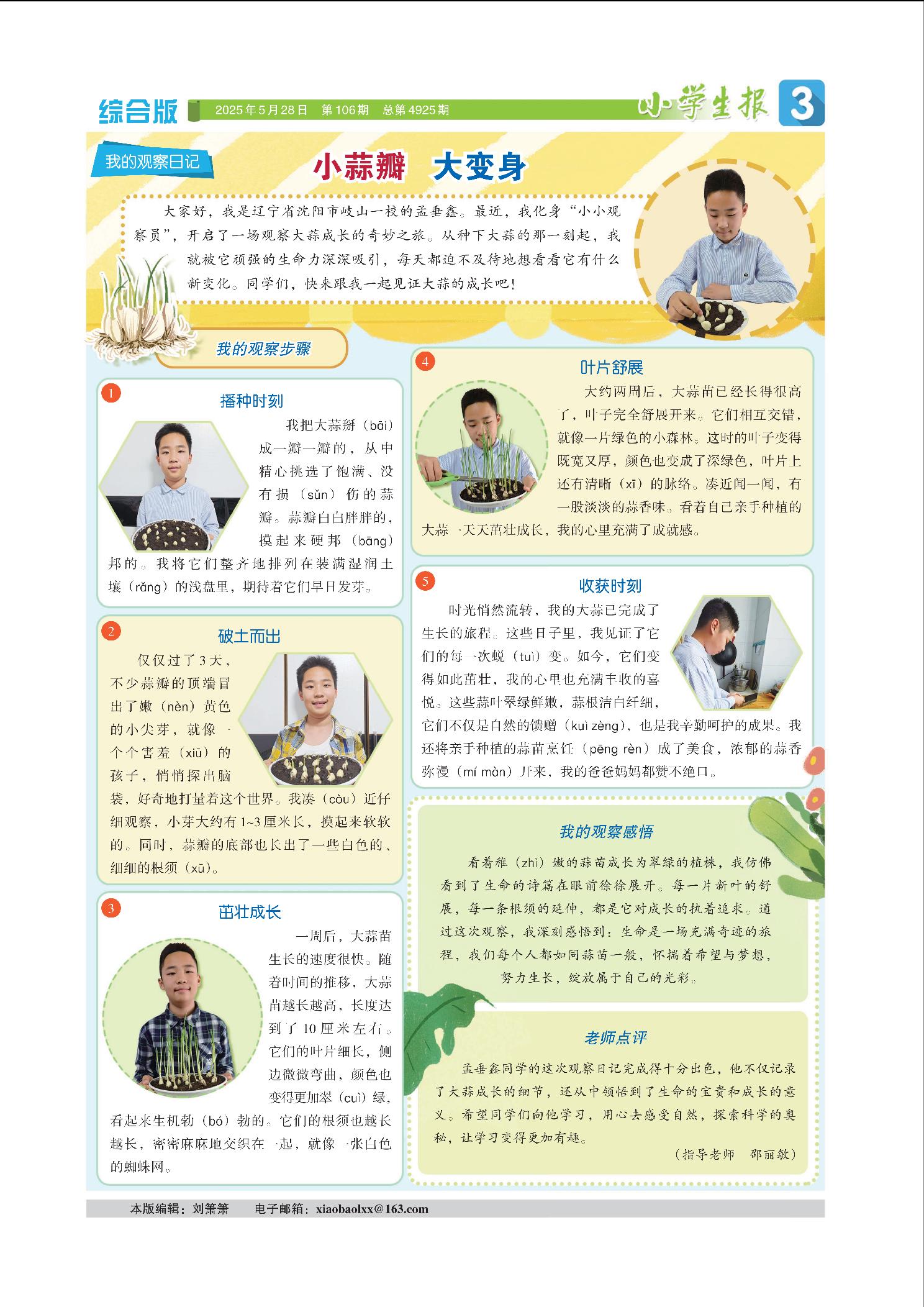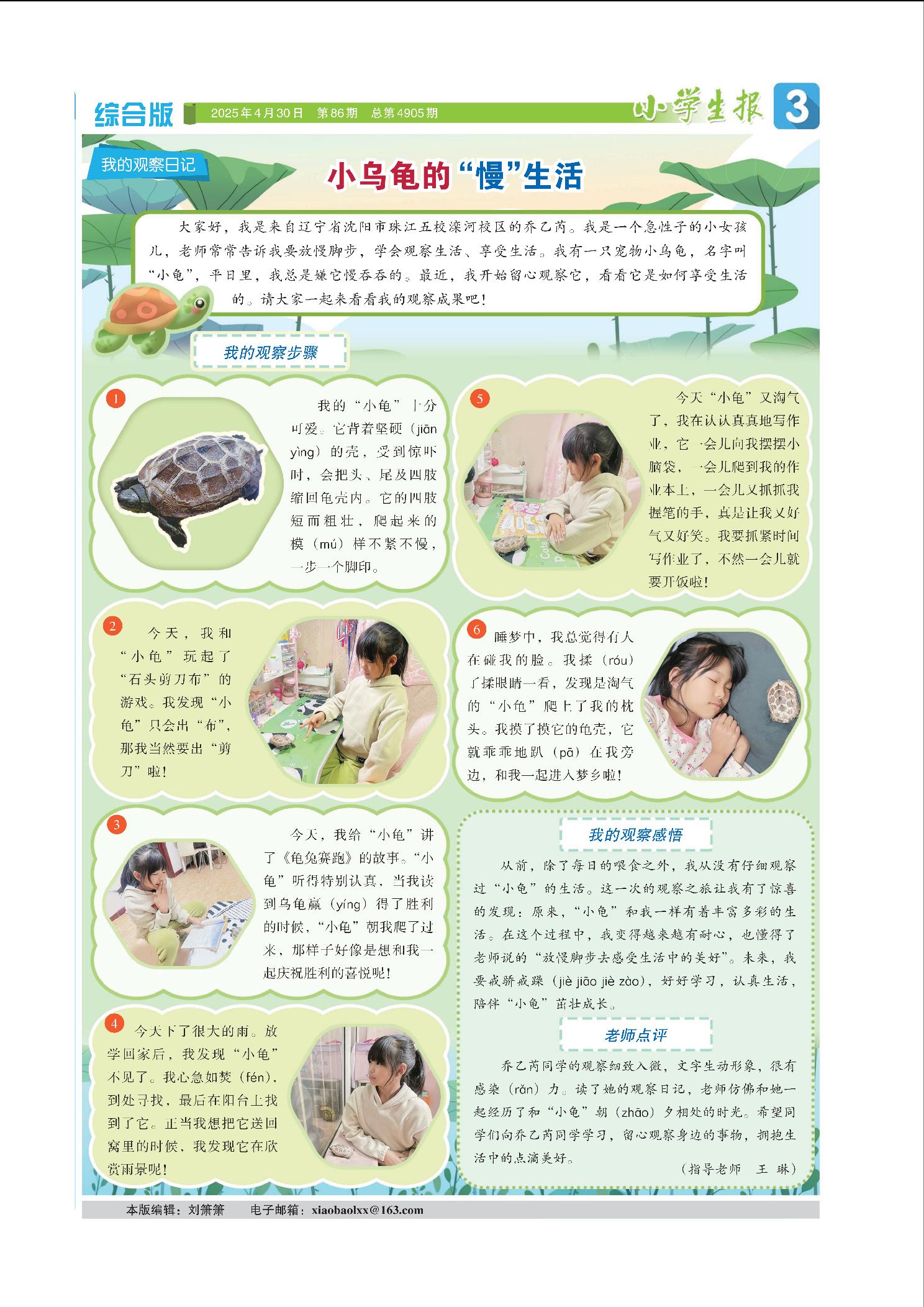 “我的观察日记”并不是简单的“写作栏目”,而是给了小作者们一双“发现生活的眼睛”,鼓励孩子们在细碎的日常里,触摸生命的鲜活,读懂“用心感知”的可贵。